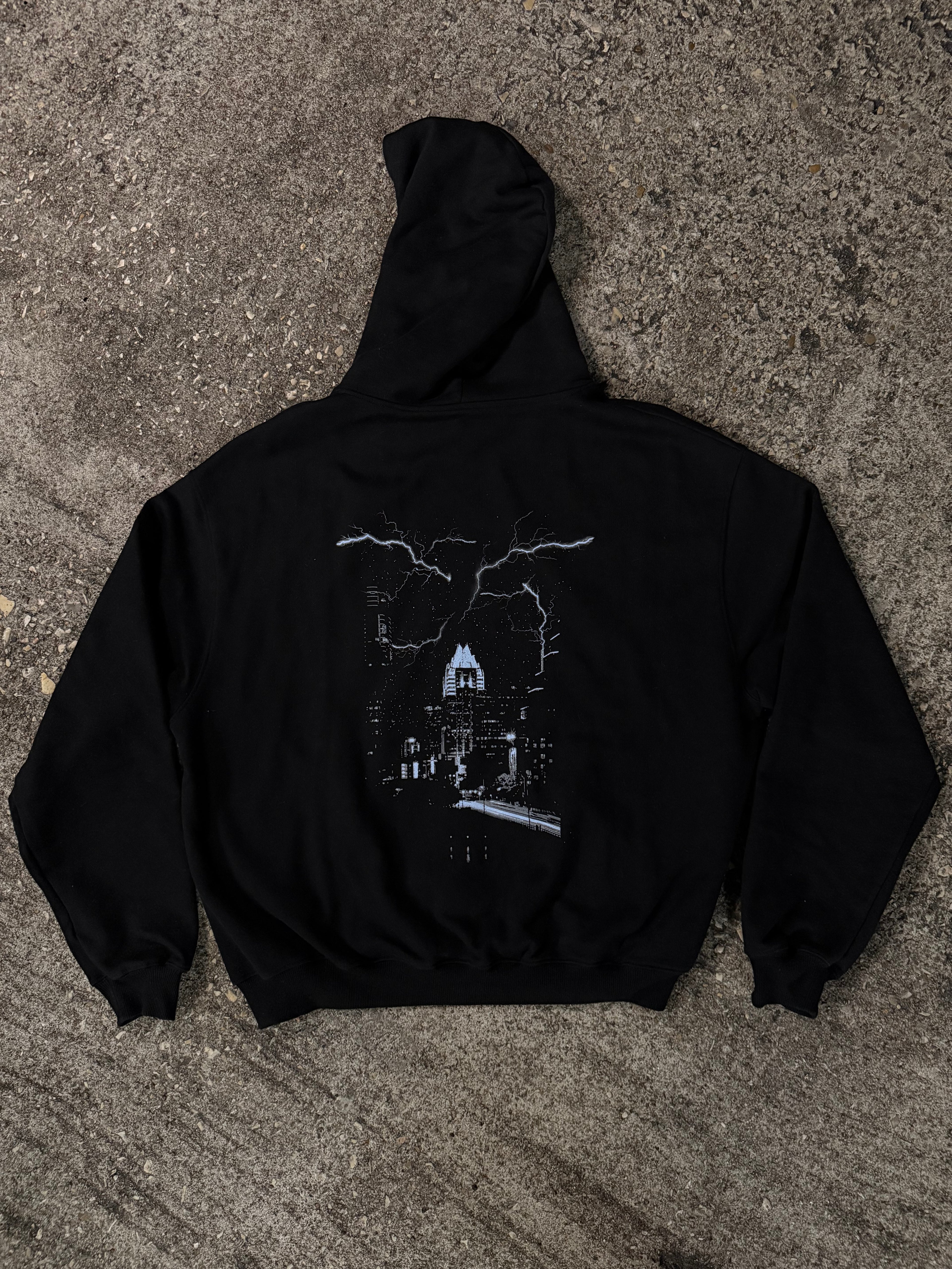 Crafted with premium heavyweight fabric, this staple hoodie offers both comfort and durability, embodying our commitment to quality over quantity. Featuring a bold graphic of Austins' famous Frost Bank on the back. Designed to make a statement that lasts.